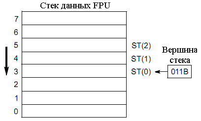 Команды блок FPU рассматривают регистры данных как стек (рисунок 16). При этом, адресация регистров данных осуществляется относительно вершины стека (адрес которой хранится в поле TOP регистра состояния). При загрузке данных в стек, адрес вершины стека уменьшается на 1 и загрузка осуществляется в тот регистр, на который указывает вершина стека. При считывании данных из стека, сначала считывается число из вершины стека в память, а затем увеличивается адрес вершина стека. Однако, стоит заметить что имеются операции загрузки и чтения данных из стека, которые не "проталкивают" данные в стеке.