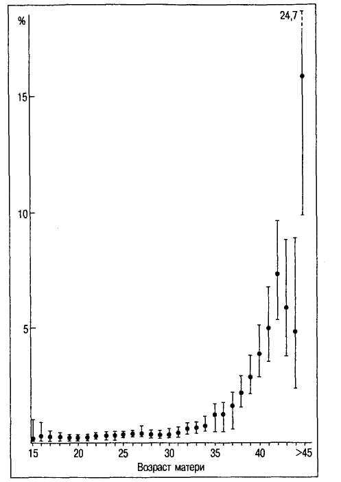 Частота новорожденных с синдромом Дауна (с указанием 95% доверительных интервалов (по Фогель, Мотульски, 1990)