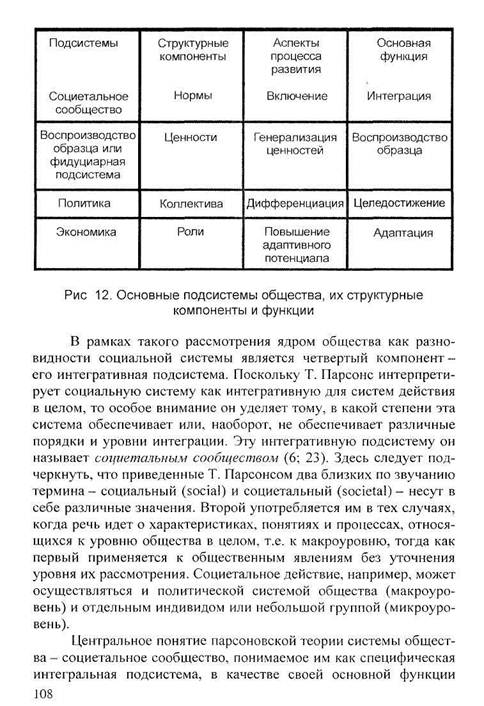Кроме стратификационных компонентов в структуру социетального сообщества включается также гражданство, особенно значимое для современных демократических обществ, религиозная, политическая, экономическая системы, а также высокоразвитая правовая система, занимающая центральное место в стабильном социетальном сообществе. В своей общей теории действия Т. Парсонс движется от рассмотрения индивидуального выбора, осуществляемого актором, к общей концепции действия, к рассмотрению действующей системы. Эта общая система действия структурирована и представлена взаимодействием четырех охарактеризованных «аналитически отличимых» подсистем: биологической, культурной, личностной и социальной. Все они оказывают влияние на действие, каждая из них стремится к поддержанию своих границ и к интеграции, обменивается информацией с другими подсистемами. В иерархии систем действия высшее место занимает культурная система, которая обладает наивысшим организационным потенциалом, вследствие чего оказывает наибольшее контролирующее влияние на другие системы действия. Именно она осуществляет легитимацию общественного нормативного порядка, определяет основания существующих в обществе прав и запретов, прежде всего, требует использования власти.