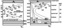 Диаграммы изотермического превращения переохлажденного аустенита. Если точки a и b кинетических кривых превращения А - П расположить по вертикали по мере снижения температуры, то получим диаграмму изотермического превращения переохлажденного аустенита.