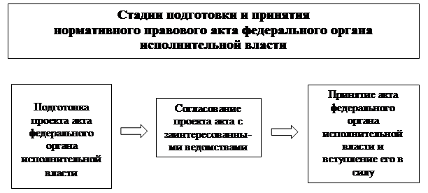 Производство по подготовке и принятию нормативных правовых актов федеральных органов исполнительной власти предусматривает следующие стадии: 1) подготовка проекта акта федерального органа исполнительной власти; 2) согласование проекта акта федерального органа исполнительной власти; 3) принятие федеральным органом исполнительной власти управленческого акта и вступление его в силу (рис. 2.17).