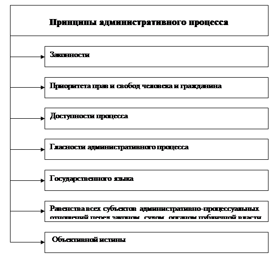 Исходными для административного процесса являются конституционные принципы: законности; приоритета прав и свобод человека и гражданина; равенства прав всех лиц перед законом и судом; а также принцип презумпции невиновности; право каждого на судебную защиту; гласность, открытость, доступность процесса; право каждого на возмещение материального ущерба и морального вреда в связи с незаконным ограничением прав и законных интересов.