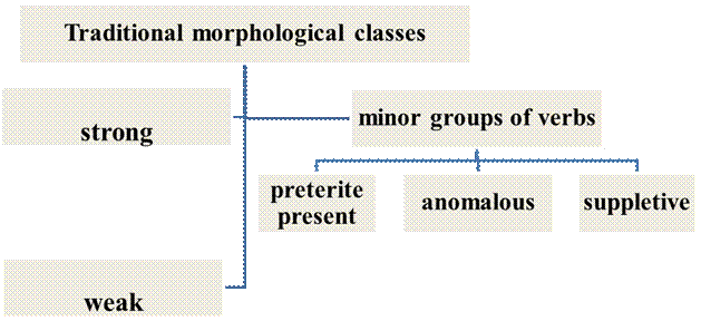 | closed class (the irregularity of the strong verbs is due to the fact that verbs of this type are much less numerous than weak verbs. In Old English there only over 300 of them) | |