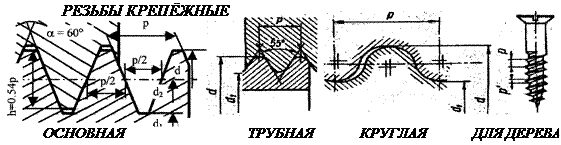 - різьблення кріпильні для фіксації деталей (основна – метрична із трикутним профілем, трубна – трикутна з округленими вершинами й западинами, кругла, різьблення гвинтів для дерева) повинні мати самогальмування для надійної фіксації;