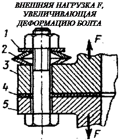 Зовнішнє навантаження F деформує не тільки болт, але й прокладки, шайби, тарілчасті пружини й т.п. (1,2). Тому при розрахунку сумарного навантаження болта FΣ уводять поняття коефіцієнта зовнішнього навантаження χ, рівного збільшенню навантаження болта в частках від зовнішнього навантаження. Тоді