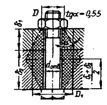 У складному випадку піддатливість системи визначають як суму податливостей окремих ділянок болта й окремих деталей. Під площами перетину A розуміють площі тих частин, які піддані деформації від затягування болта. Тут думають, що деформації від гайки й головки болта розташовуються вглиб деталей по конусах з кутом α = 30о. Дорівнюючи обсяг цих конусів до обсягу циліндра, знаходять його діаметр