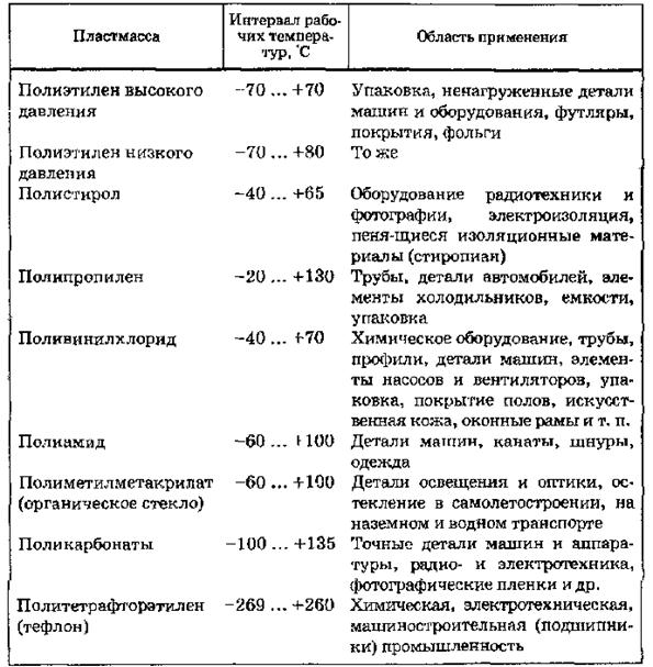 Таблица 2. Области применения некоторых термопластичных пластмасс