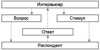 Итак, в рамках описанной схемы существует пять объектов, которые участвуют в процессе, который мы обозначили как "опрос". Рассмотрим их. "Интервьюер" - физическое лицо, юридическое лицо (группа лиц) или техническое устройство, задающие вопрос респонденту с целью получения ответа на основе определенного стимулирования. "Респондент" - физическое или юридическое лицо (группа лиц), мнение которого по определенному вопросу представляет интерес для интервьюера. "Вопрос" это сформулированная интервьюером задача (рациональная или эмоциональная), имеющая одну или несколько возможных форм разрешения, ориентированная на интеллектуальный, эмоциональный и этический уровень респондента. "Стимул" - эмоциональный или рациональный мотив ответа на вопрос, создаваемый интервьюером и ориентированный на систему ценностей респондента. "Ответ" - мотивированная на основе стимула, предоставляемого интервьюером, реакция респондента на заданный вопрос, выраженная в любой форме, которую может зафиксировать интервьюер.