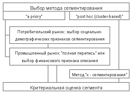 В мировой практике используются два принципиальных подхода к маркетинговому сегментированию. В рамках первого метода, именуемого "a priory", предварительно известны признаки сегментирования, численность сегментов, их количество, характеристики, карта интересов. То есть подразумевается, что сегментные группы в данном методе уже сформированы. Метод "a priory" часто используют в тех случаях, когда сегментирование не является частью текущего исследования, а служит вспомогательным базисом при решении других маркетинговых задач. Иногда этот метод применяют при очень четкой определенности сегментов рынка, когда вариантность сегментов рынка не высока. "А priory" допустим и при формировании новой услуги, ориентированной на известный сегмент рынка. В настоящем пособии метод реализации сегментирования "a priory" рассмотрен в разделе 4.1.