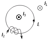 по контуру обхода L в вакууме (см. рисунок), если I1=1 A, I2=2 A, I3=3 A? Укажите номер правильного ответа. m0=4p×10-7 Гн/м.