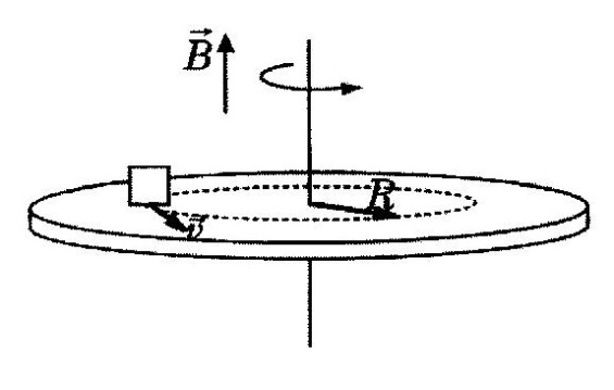 5.На шероховатом непроводящем диске, расположенном в горизонтальной плоскости, лежит точечное тело, находящееся на расстоянии R = 0,5 м от центра диска, и несущее заряд q = 75 мкКл. Диск равномерно вращается вокруг своей оси, совершая n = 0,5 оборота в секунду. Коэффициент трения между телом и поверхностью диска равен μ = 0,6. Какой должна быть минимальная масса m тела для того, чтобы в однородном магнитном поле с индукцией В = 2 Тл тело не скользило по поверхности диска?