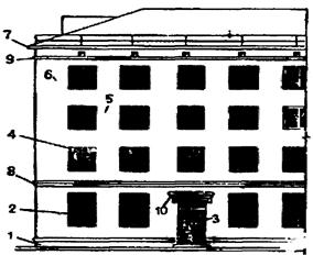 1 – цоколь: 2 – оконный проем; 3 – дверной проем: 4 – перемычки; 5 – простенок рядовой; 6 – простенок угловой; 7 – карниз венчающий; 8 – карниз промежуточный: 9 – поясок; 10 – сандрики; 11 – полуколонны; 12 – ниши; 13 – контрфорс