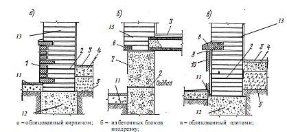 Цоколи зданий можно устраивать из бетонных фундаментных блоков, такой цоколь называется подрезным; из кирпича с расшивкой швов или оштукатуренного цементным раствором (нередко применяют добавку в виде гранитной крошки); из природного камня или плит из искусственных и природных материалов (рисунок . 9.2). Применение силикатного, пустотелого и легкого кирпича, легкобетонных камней для устройства цоколя допускается только выше горизонтальной гидроизоляции при условии облицовки на высоту 500—600 мм прочными влаго- и морозостойкими материалами.