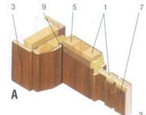 Дверной блок представляет собой дверную коробку с навешенным на неё полотном. Установленный в проём каменных стен или перегородок такой блок защищают от гниения, кроме того, его закрепляют, как и оконные блоки, к деревянным вкладышам, заделанным в откосы проёма. Порог у большинства наружных дверей, в том числе и балконных, несколько приподнят. Дверной блок в проёме перегородки устанавливают в одной плоскости (заподлицо) с одной из поверхностей ограждения. Затем его крепят к брускам, обрамляющим проём, или к деревянным вкладышам. Заделывают зазоры между коробкой и перегородкой, а стык закрывают наличником.