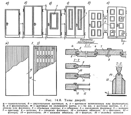 -филёнчатые, состоящие из контурной обвязки, усиленной средником, и филёнок (заполнения) из фанеры и дощатых щитов. Такая конструкция полотен трудоёмка в изготовлении, требует качественной древесины и поэтому в современном строительстве применяется только для парадных дверей общественных зданий;