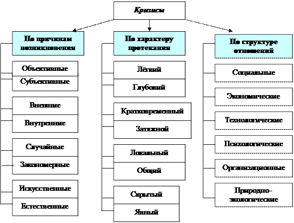 Практика показывает, что кризисы неодинаковы по причинам, последствиям и по своей сути. Разветвлённая классификация кризисов позволяет выявить средства и способы управления ими, а также появляются возможности снижения остроты их протекания (рисунок 1).