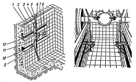 Рис. 17. Гидравлический подъемник: а – устройство подъемника осмотровой канавы; б – использование двух подъемников для вывешивания задней части автомобиля; 1 – каток; 2 – скалка; 3 – страхующий штырь; 4 – шток; 5 – подхват; 6 – гильза; 7 и 10 – направляющие; 8 – кран управления; 9 – гидравлический цилиндр; 11 – регулируемый упор; 12 – каретка