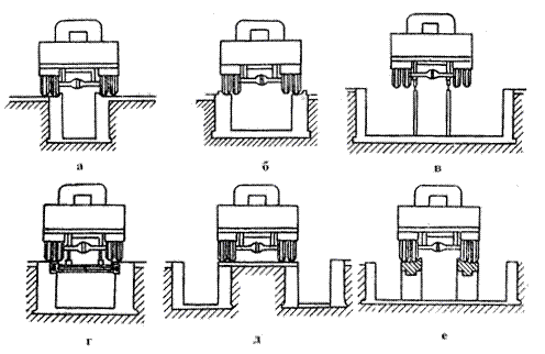 Рис. 18.Схемы осмотровых канав: а – межколейная с внутренними ребордами; б – межколейная с наружними ребордами; в – широкого типа; г – безребордная; д – боковая; е – колейный мост