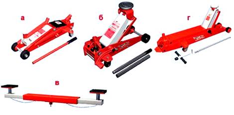 Рис. 19. Подкатные гидравлические домкраты: а – для личного использования автомобилистом; б – для автосервисов и шиномонтажных мастерских, г – для обслуживания тяжелых автомобилей и спецавтотехники; в – раздвижная траверса