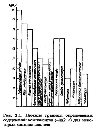 Чувствительностьметода или методики определяется тем минимальным количеством вещества, которое можно обнаруживать или определять данным методом, по данной методике (более строгое определение этого понятия и его количественное выражение см. далее в этой же главе). На рис. 2.1 приведена относительная характеристика чувствительности некоторых методов. Нижняя граница определяемого содержания демонстрирует возможности метода и наилучший результат, достигаемый при определении ряда веществ.