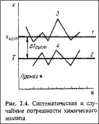 К систематическим относят погрешности, которые вызваны постоянно действующей причиной, постоянны во всех измерениях или меняются по постоянно действующему закону, могут быть выявлены и устранены. Случайные погрешности, причины появления которых неизвестны, могут быть оценены методами математической статистики. Промах — это погрешность, резко искажающая результат анализа и обычно легко обнаруживаемая, вызванная, как правило, небрежностью или некомпетентностью аналитика. На рис. 2.4 представлена схема, поясняющая понятия систематических и случайных погрешностей и промахов. Прямая 1 отвечает тому идеальному случаю, когда во всех N определениях отсутствуют систематические и случайные погрешности. Линии 2 и 3 тоже идеализированные примеры химического анализа. В одном случае (прямая 2) полностью отсутствуют случайные погрешности, но все N определений имеют постоянную отрицательную систематическую погрешность Dх ; в другом случае (линия 3) полностью отсутствует систематическая погрешность. Реальную ситуацию отражает линия 4: имеются как случайные, так и систематические погрешности.