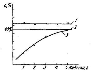 Один из основных признаков систематической погрешности — то, что она постоянна во всех измерениях или меняется по постоянно действующему закону. Следует отметить, что абсолютные систематические погрешности делят на не зависящие и зависящие от содержания определяемого компонента, т. е. на постоянные (аддитивные) и пропорциональные (мультипликативные). К постоянным погрешностям можно отнести, например, капельную и некоторые виды индикаторных ошибок в титриметрии, ошибку взвешивания в гравиметрии; к пропорциональным — некоторые виды погрешностей, обусловленных вкладом мешающих примесей в аналитический сигнал определяемого компонента. На рис. 2.6 проиллюстрировано изменение правильности определения содержания компонента с увеличением навески анализируемой пробы при наличии постоянной и линейно изменяющейся погрешности. С увеличением массы пробы анализируемого вещества при наличии постоянной систематической погрешности величина относительной ошибки уменьшается (кривая 3), а при линейно меняющейся систематической погрешности относительная ошибка остается постоянной (кривая 1).