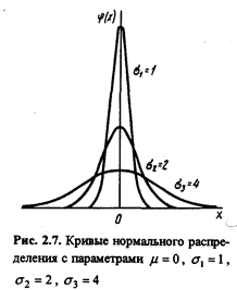 Графическое изображение нормального распределения случайной величины х показано на рис. 2.7. Вид колоколообразных кривых, симметричных относительно вертикальной линии проходящей через m, зависит от величины дисперсии и, следовательно, от стандартного отклонения. Чем больше стандартное отклонение, тем более пологой становится кривая.