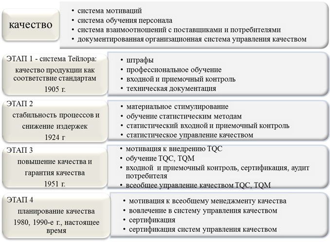 Интерес к менеджменту качества возник со становлением массового промышленного производства. С конца 19 века и до сегодняшнего времени менеджмент качества прошел несколько этапов, которые связаны с развитием определенных технологий производства. Эти этапы не имеют четко выделенных границ, т.к. развитие и становление тех или иных методов управления и технологий производства не начинается и не заканчивается в один момент.