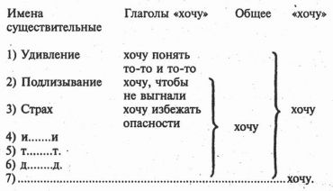 Когда таким образом найдены куски роли, следует превратить имена существительные в глаголы: «хочу…» Так как нельзя играть «удивление» (ибо это есть результат какого-то внутреннего процесса), то нужно определить, что это за процесс. Здесь начинается самоанализ и основывается «свое хотение», например: