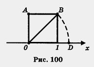 Рассмотрим пример. Дана координатная прямая, на ее единичном отрезке построен квадрат (рис. 100), диагональ квадрата ОВ отложена на координатной прямой от точки О вправо, получилась точка D. Чему равна координата точки D? Она равна длине диагоналиквадрата, т. е.