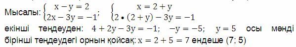 1. Теңдеудің біреуіндегі бір айнымалыны екінші айнымалы арқылы өрнектеу керек;