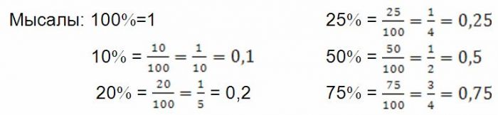Кез келген шаманың 1/100 бөлігі бір процент деп қабылданған, яғни 1% = 1/100 немесе 1% = 0,01. Процентті бөлшекпен жазу үшін 100-ге бөлу керек, ал бөлшекті процентпен жазу үшін 100-ге көбейту керек.