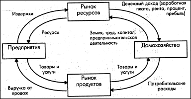 Эта модель, по сравнению с индивидуальными рынками, отражает их совокупность, сведение в два агрегированных рынка по своему назначению (продукты, ресурсы), она характеризует взаимосвязь между субъектами рыночных отношений (домохозяйства, предприятия), в ней представлены важнейшие потоки (доходы — расходы, ресурсы — продукция). Здесь выделен частный сектор, экономики, исключающий вмешательство государства. Домохозяйства, состоящие из одного или нескольких лиц, владея ресурсами, снабжают ими непосредственно или косвенно (как собственники торгово-промышленных фирм) предприятия, которые изготавливают продукцию. В свою очередь, предприятия оплачивают эти ресурсы, чтобы затем производить и продавать собственные товары. Таким образом, одни субъекты на рынке ресурсов выступают со стороны предложения, другие - со стороны спроса. И, наоборот, их интересы меняются при переходе к рынку продуктов. Соответственно, и те, и другие получают доходы и несут расходы.