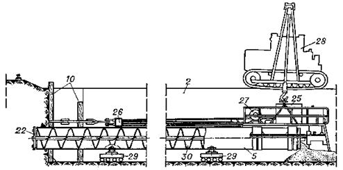 2 – рабочий котлован; 5 – прокладываемая труба; 10 – сваи; 22 – буровая коронка; 25 – двигатель; 26 – полиспаст; 27 – лебедка; 28 – трубоукладчик; 29 – роликовая опора; 30 – шнек.