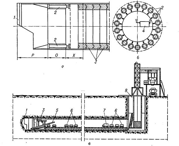 1 – нож; 2 – гидродомкраты; 3 – сборная крепь (тюбинги); 4 – золотниковый переключатель; 5 – ленточный скребковый конвейер; 6 – вагонетки; 7 – мотовоз; 8 – шахта.