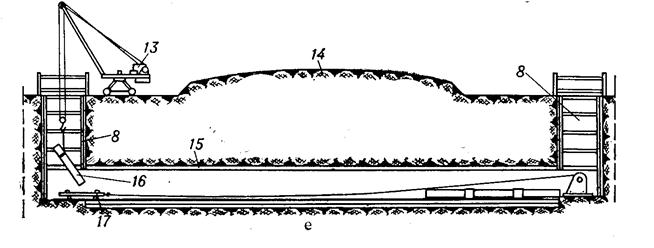 8 – шахта; 13 – кран; 14 – дорога; 15- крепление штольни; 16 – труба; 17 – тележка.