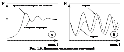 Однако плато на S‑образной кривой чаще всего не бывает гладким. Происходит постоянная флуктуация численности – колебания кривой около асимптоты К (рис. 1.6а). Флуктуации, вызванные как абиотическими, так и биотическими факторами, могут быть сезонными и годовыми. Регулярные флуктуации называют циклами (рис. 1.6б).