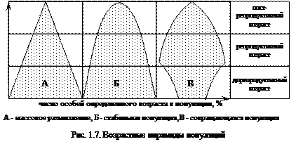 Часто для исследования возрастных структур популяций используют графические методы, например возрастные пирамиды популяции, широко используемые в демографических исследованиях (рис.1.7). Характер распределения особей популяции по возрастным группам позволяет прогнозировать динамику численности популяции на последующие периоды. Исследования численности популяций и определяющих ее факторов позволяет оценить последние и в отдельных случаях обеспечить ее биологическое pегулиpование.