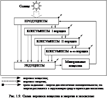 Таким образом, несмотря на многообразие экосистем, все они обладают структурнымсходством. В каждой из них можно выделить синтезирующие организмы – продуценты, различные уровни консументов, детритофагов и редуцентов. Они и составляют биотическую структуру экосистем, элементы которой объединены многочисленными связями, вещественными и энергетическими потоками(рис. 1.9).