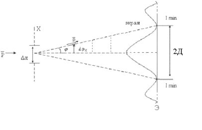 В данной работе соотношение неопределенностей (3.5) проверяется экспериментально для фотонов. На опыте измеряется ширина щели Dх, которая характеризует неопределенность координаты фотона в направлении х, и ширина главного центрального - фракционного max 2Д, характеризующая неопределенность значения поперечной составляющей импульса фотона Dрх.