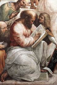 (427 – 347 гг. до н. э.) – ученик Сократа, настоящее имя – Аристокл (Платон – прозвище, «широ-коплечий»). Центральной темой философии Платона является учение об идеях. Еще Сократом высказывалась мысль, что идеи являются умозрительными сущностями, безусловными образами бытия, совпадающими с безусловным образом мышления. У Платона, по Владимиру Соловьеву, мы имеем «возможность трех главных способов разумения идей: 1) Идеи суть общие родовые понятия, то, что потом в схоластике называлось universalia; например, то общее, что все прекрасные отдельные предметы имеют между собой, есть идея прекрасного, или сама красота, т. е. тожественная себе чистая мысль о прекрасном… 2) Идеи суть действительные первообразы данных в являемом мире предметов или особые качественные реальности, отличающиеся от чувственных вещей вечностью, неизменностью и высочайшим превосходством во всех отношениях. Созерцая эти идеи (в этом смысле), Божество, как Димиург (Зиждетель), творит по ним, как по образцам, чувственные вещи, или сам, или через подчиненные ему творческие силы… 3) Идеи суть безусловные умопостигаемые нормы или первоначала достойного существования, достаточные основания для определения положительной качественности всего существующего, вечные пределы всякого бытия с трех главных сторон – этической, логической и эстетической. Идея идей есть добро, или благо, или благость – безусловная норма всякого достоинства вообще, отожествляемая Платоном с Божеством в абсолютном смысле; из нее в правильном порядке проистекают все остальные идеи»[7].