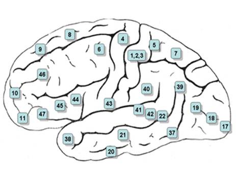 Рисунок 1 – Боковая поверхность мозга с пронумерованными полями Бродмана