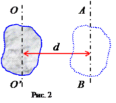 Теорема Гюйгенса-Штейнера: момент инерции тела J0’0’ относительно любой оси вращения АВ равен сумме момента его инерции J00’, относительно параллельной оси 00’, проходящей через центр масс тела, и произведению массы тела на квадрат расстояния dмежду осями АВ и 00’ (см. рис.2)