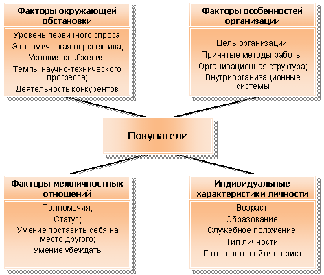 4) Характер влияния на поведение лиц, принимающих решение о покупке, факторов окружающей обстановки, особенностей организации, межличностных отношений и индивидуальных характеристик личности (рис.10.4).