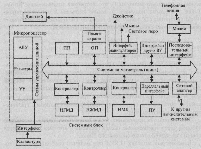 АЛУ– арифметико-логическое устройство; УУ– устройство управления; ПП– постоянная память; ОП– оперативная память; ВУ– внешнее устройство; НГМД– накопитель на гибких магнитных дисках; НЖМД– накопитель на жестких магнитных дисках; НМЛ– накопитель на магнитной ленте; ПУ– печатающее устройство.