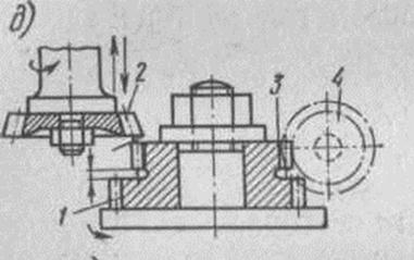 На рис.6, д пунктиром показано положение фрезы 4, которая не может нарезать зуб на венце 3 колеса ввиду невозможности ее выхода так как как расстояние между венцами Зи 1 всего 5—6 мм. Тот же венец, отстоящийот другого венца на расстоянии 5—6 мм, успешно нарезается долбяком 2, для выхода которого вполне достаточно 2-4мм.