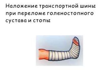 При переломе костей стопы накладывают две лестничные шины. Одну из них накладывают от кончиков пальцев по подошвенной поверхности стопы и затем, согнув под прямым углом, - вдоль задней поверхности голени, почти до коленного сустава. Шину моделируют по очертанию задней поверхности голени. Дополнительно накладывают боковую шину в форме буквы V, накладывают вдоль наружной поверхности голени с таким расчетом, чтобы она охватила подошвенную поверхность стопы наподобие стремени. Шины прибинтовывают к конечности.