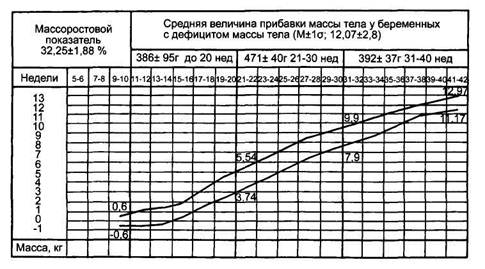 Величину прибавки массы тела отмечают у беременных нормостенического телосложения [массоростовой показатель (МРП) 38,13 + 3,07 %], с избыточной (МРП 48,36 ± 6,31 %) и недостаточной (МРП 32,25 ± 1,88 %) массой тела. Интервалы между двумя указанными линиями означают параметры нормальной прибавки массы в соответствии с весовыми категориями. При очередном осмотре величину прироста массы указывают точками, соединяя их линией. Для ориентировки нормальной прибавки массы тела в гравидограмме представлены верхняя и нижняя граница нормы в определенные сроки беременности. Женщины с первоначальной недостаточной массой тела могут больше прибавлять в весе, чем остальные беременные.