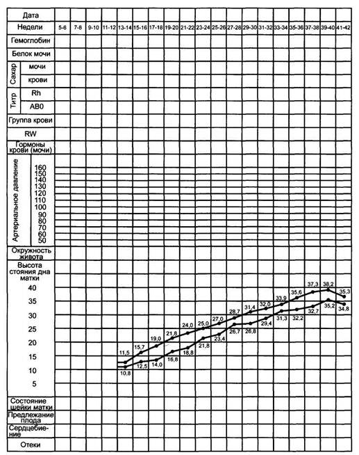 Показатели, указанные в первых графах, следует записывать в их числовом выражении. В шкале «АД» отмечают точками показатели систолического и диастолического давления, соединяя последовательно их линиями, что поможет составить график динамики АД при наблюдении за беременной. Особое внимание необходимо обращать на динамику высоты стояния дна матки, которая представлена доверительными интервалами ее нормы.