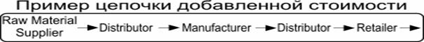 Цепочка добавленной стоимости (известная также как система бизнеса) представляет собой описательную модель, которая применяется для подробного освещения последовательности оперативных и функциональных действий. В примере на рис. 4 цепочка добавленной стоимости применяется для того, чтобы описать производственные стадии товара.